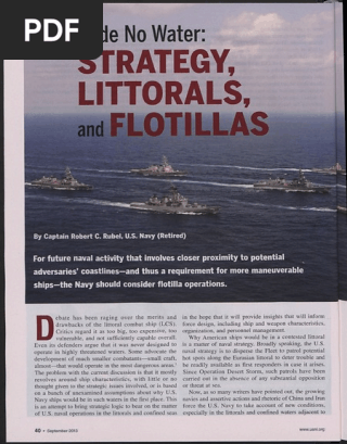 Debate has been raging over the merits and drawbacks of the littoral combat ship (LCS). Critics regard it as too big, too expensive, too vulnerable, and not sufficiently capable overall. Even its defenders argue that it was never designed to operate in highly threatened waters. Some advocate the development of much smaller combatants—small craft, almost—that would operate in the most dangerous areas. 1 The problem with the current discussion is that it mostly revolves around ship characteristics, with little or no thought given to the strategic issues involved, or is based on a bunch of unexamined assumptions about why U.S. Navy ships would be in such waters in the first place. This is an attempt to bring strategic logic to bear on the matter of U.S. naval operations in the littorals and confined seas in the hope that it will provide insights that will inform force design, including ship and weapon characteristics, organization, and personnel management.